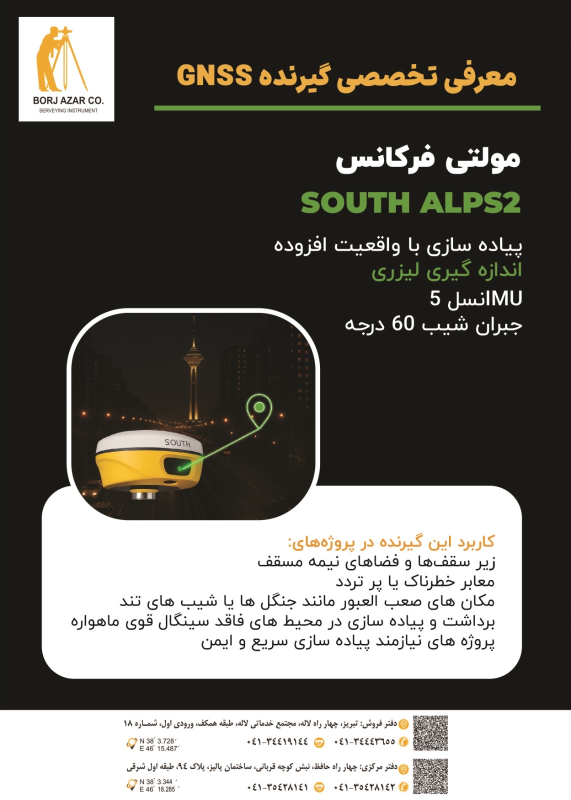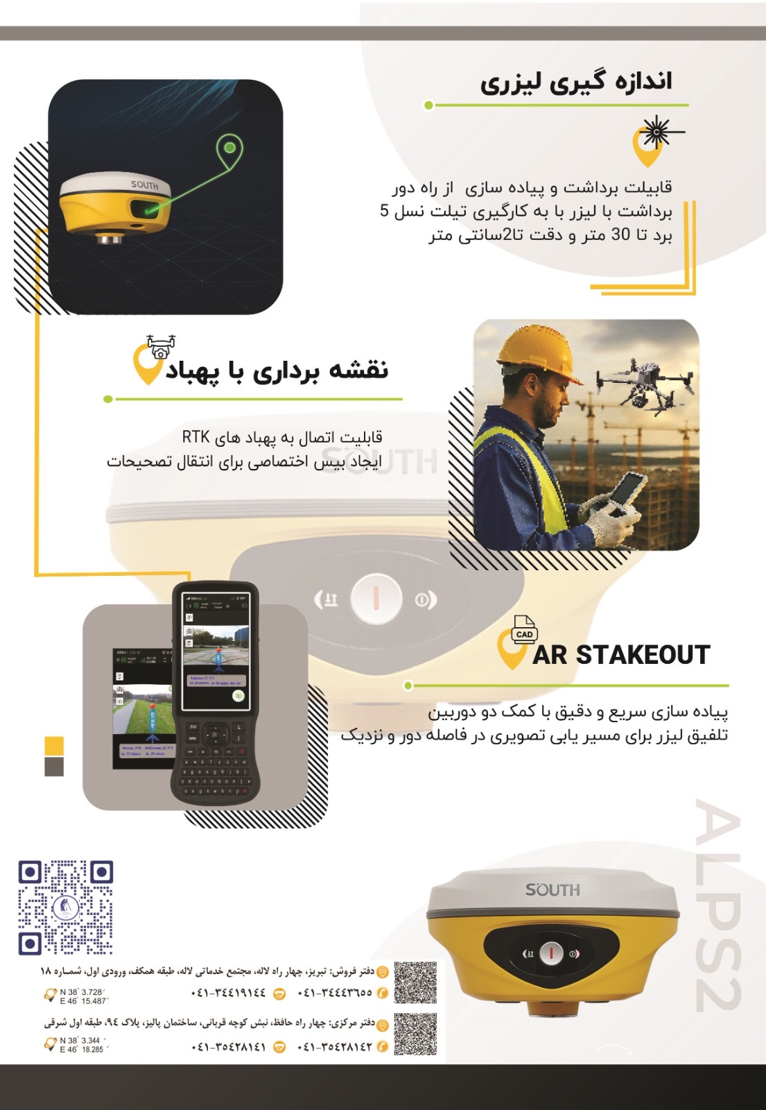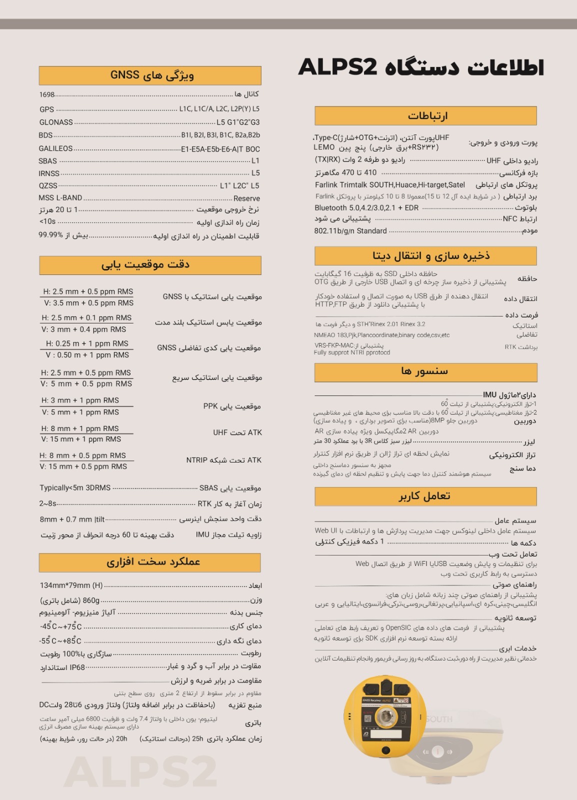 ۱۶۹۸ کانال ، دارای رادیو مودم داخلی ، دارای تیلت سنسور IMU120 درجه ، دارای دوربین AR، دارای لیزر نور سبز، باطری داخلی ، بدنه فلزی ، کم حجم: ریسیور بهمراه کنترلر آندرویدی جدید H9 به انضمام هولدر و متعلقات استاندارد کیف حمل فایبر گلاس