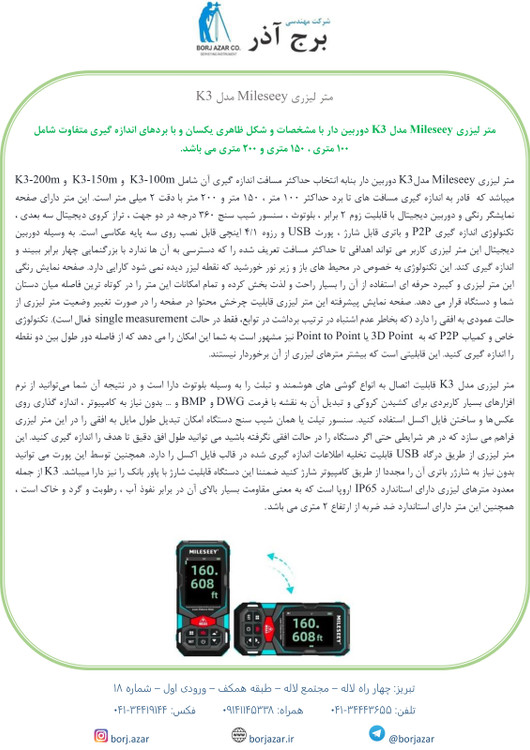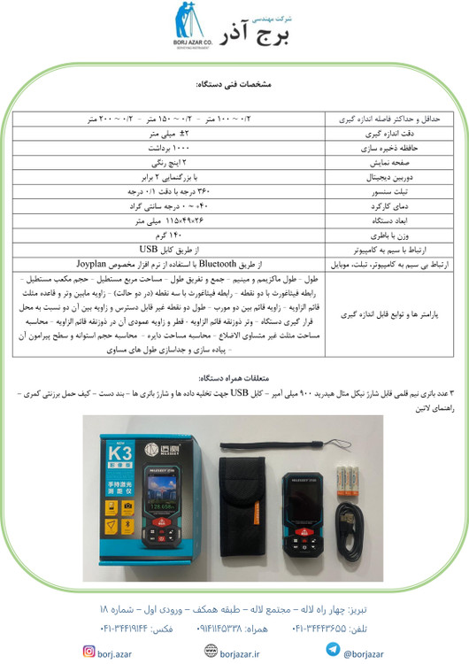 متر لیزری ، باطری قابل شارژ ، کابل ارتباط با کامپیوتر ، کیف کمری ، بند دست
